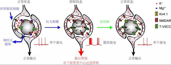 通过高通量的定量蛋白质谱技术,他们发现抑郁的形成伴随着胶质细胞中钾离子通道Kir4.1的过量表达。而Kir4.1通道对抑郁的调控植根于缰核组织中胶质细胞对神经元的致密包绕这一组织学基础。在神经元-胶质细胞相互作用的狭小界面中,Kir4.1在胶质细胞上的过表达引发神经元细胞外的钾离子浓度降低,从而诱发神经元细胞的超极化、T-VSCC钙通道活化,最终导致NMDAR介导的簇状放电。