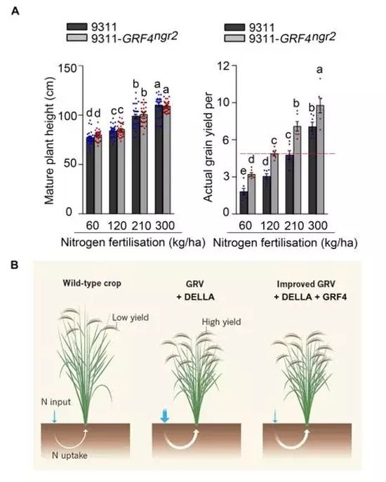 作为“绿色革命”品种典型特征的DELLA蛋白高水平累积使其获得了半矮化优良农艺性状,但是却伴随着氮肥利用效率降低。通过将GRF4-DELLA平衡向GRF4丰度的增加倾斜,可以在维持半矮化优良性状的同时提高“绿色革命”品种的氮肥利用效率并增加谷物产量。