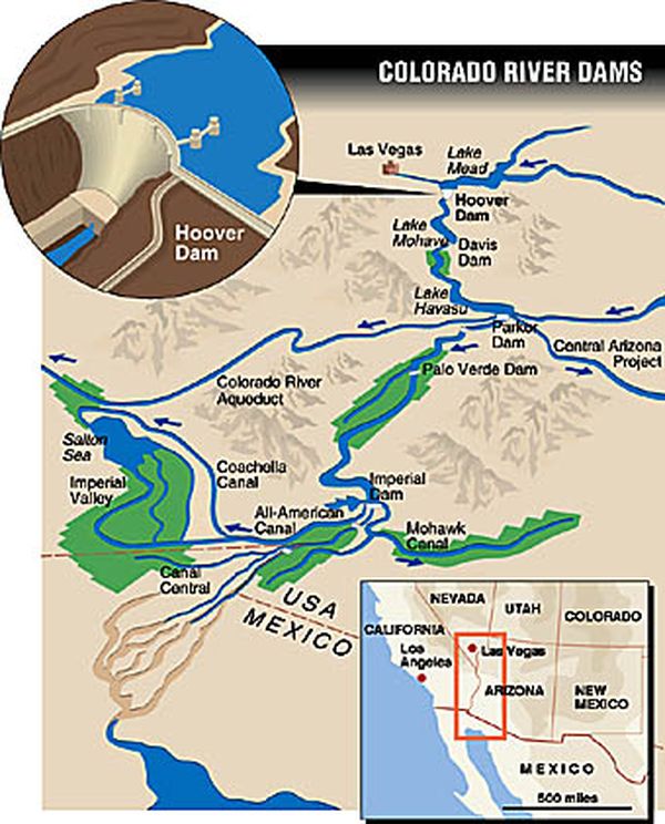 胡佛大坝是科罗拉多河上的第一个大型工程,建成于1935年,是当时世界上最高的拱形坝,坝高213.4m,坝顶长379.2m,其庞大的混凝土拱坝挡住了科罗拉多河的河水,上游绵延160km,形成了美国最大的水库米德湖水库,成为美国著名的休闲旅游风景区。胡佛水坝当初主要是为防洪所建,电力仅为副产品,但建成后却成了南加州主要电力来源。