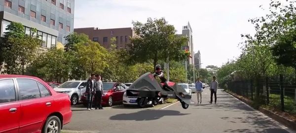 这款飞行器从外观上看像一个加了底盘的摩托车,