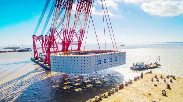 舟岱大桥首个防撞钢套箱安装完成。(中交路桥建设有限公司图)