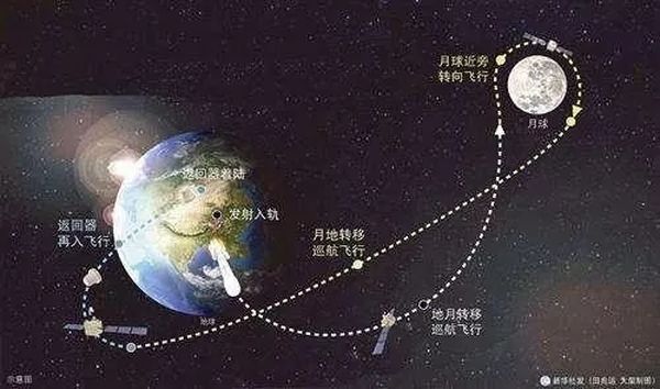 嫦娥五号探测器的探月“路线图”基本是这样的:经地月和环月飞行,在月球表面选定的区域着陆,采集月球的样品,再经过月面起飞、月球轨道交会对接和样品转移,月地转移和再入回收等过程,将月球样品安全送至地面,供科学家开展相应的探测和研究工作。