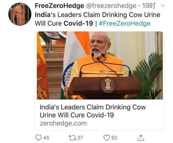 ▲ 印度教领袖还说喝牛尿可以放新冠呢(《印度时报》报道)