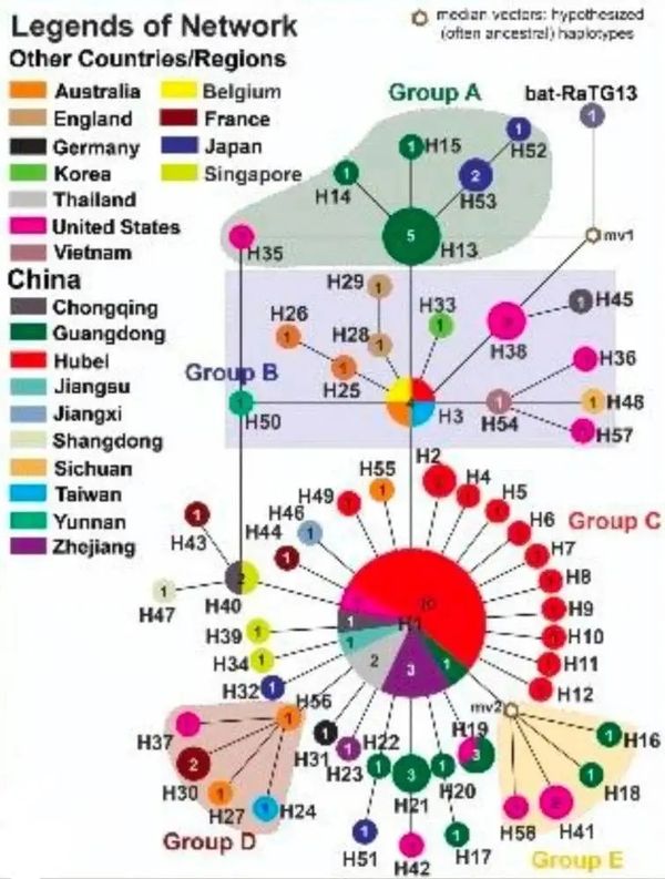 我们主要看第一组,也就是A组。大家可简化的认为:最早的病毒祖宗就是mv1(原发病例),病人目前还没有发现,它演化出来的H13和H38共同孕育了第二代病毒H3(杂交?)。而H3又演化为H1。