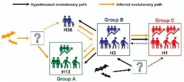 通俗理解,病毒mv1是祖宗,H13和H38是爷爷奶奶,H3是爸爸,H1是儿子。分别对应A、B、C三个组。