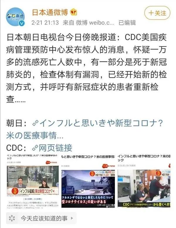 事后证明,这是《朝日新闻》过度解读了CDC的公告,人家只说部分病例不是流感,没说他就是COVID-19对吧?