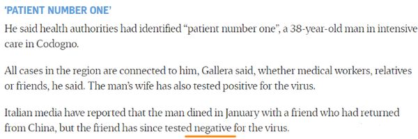 那么意大利呢?根据外媒报道,意大利的“1号病人”已经明确,是一个38岁的人,经过排查,他虽然接触过从中国回来的朋友,但那个朋友经检测并未感染。