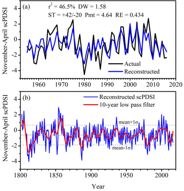 图2.缅甸南部柚木年轮宽度指数与旱季(11月-4月)干湿指数(scPDSI)对比(a),缅甸南部柚木年轮宽度重建的过去215年旱季干旱指数序列(b)