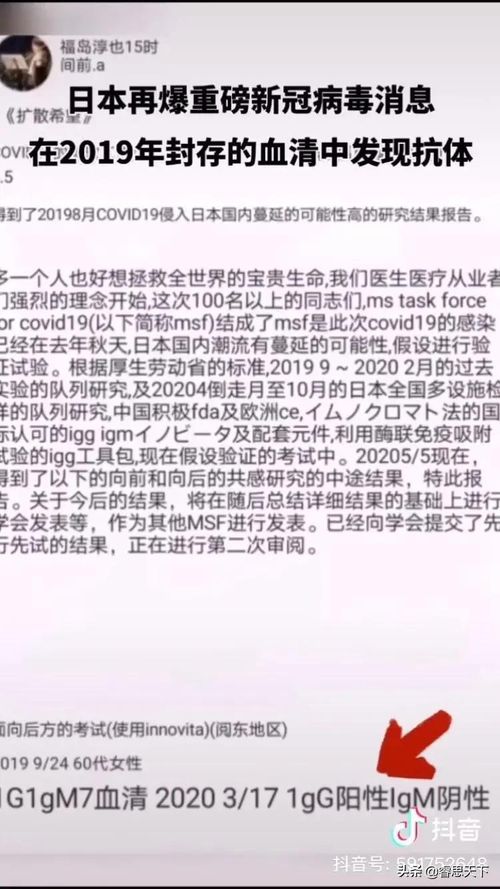 5月5日,日本筑波大学福岛润也博士,在脸书发布消息:通过对日本54名2019年9月到2020年2月之间患有肺部疾病患者的研究,通过病患冷冻血清检测,发现了8名患者血清中含有新冠病毒IgG抗体。也就是说,这些人去年患肺部疾病的时候,其实是感染了新冠病毒。