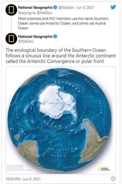 美国国家地理学会表示,自1915年美国国家地理学会开始绘制地图以来,已经确认了世界上有四大洋——大西洋、太平洋、印度洋和北冰洋。从6月8日世界海洋日开始,南大洋将被认定为世界第五大洋。南大洋将受到和四大洋一样的待遇,被收录在世界大洋科普书中。
