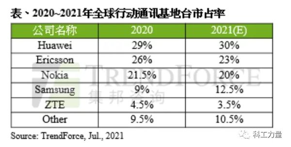 2020-2021年全球移动基站市场占有率,数据来源:集邦咨询