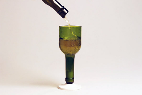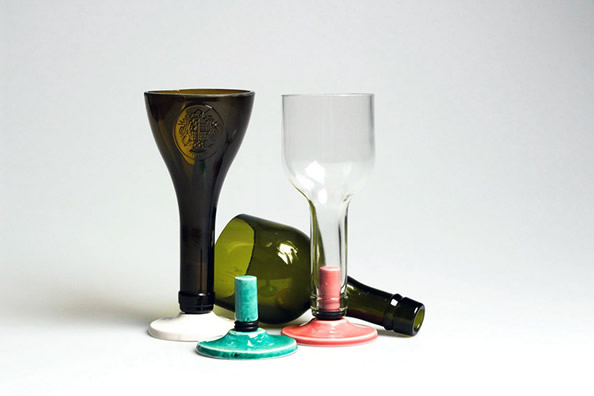 玻璃杯的主要部分由酒瓶的顶部和连接的颈部制得,把这部分倒置过来,连接到瓷器底座上面,这样酒瓶就变成酒杯了。