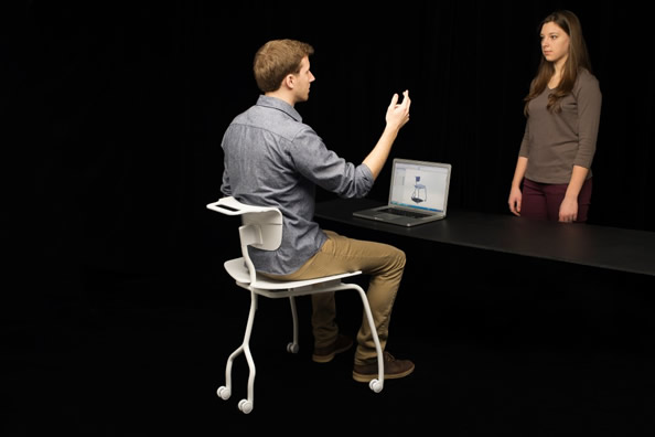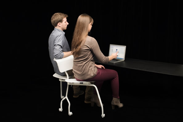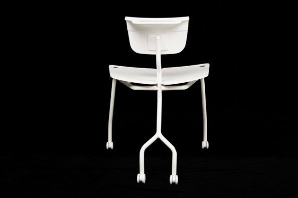 “Invitation Chair”可以将椅子的一半分享给他人,更方便的工作交流,而不是站与坐的交流。设计可方便的将椅面分成两半,而椅背可以转动,变成其中一人可使用的扶手。