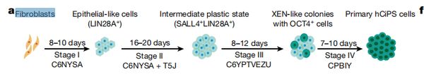 ▲论文中的示意图显示,从成纤维细胞经两步变化转变为“塑性中间态”细胞,随后干细胞开始次第萌发,最终成果实现人多潜能干细胞的化学小分子诱导。论文截图