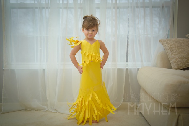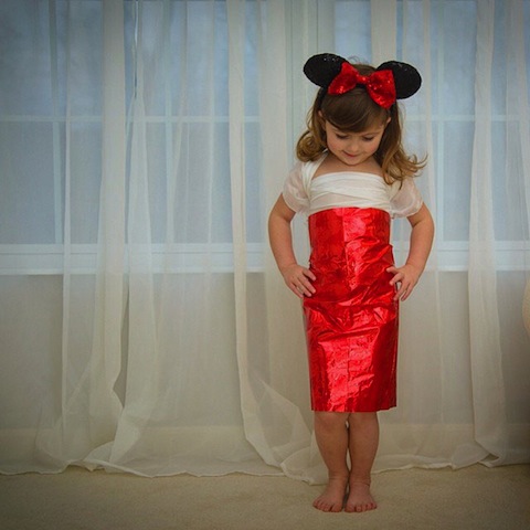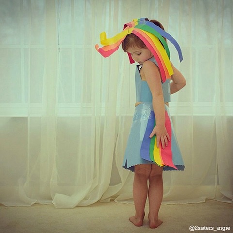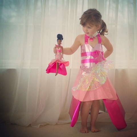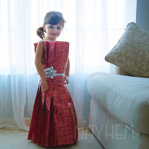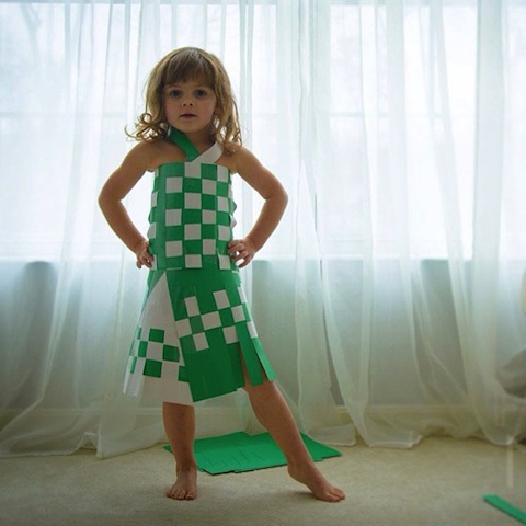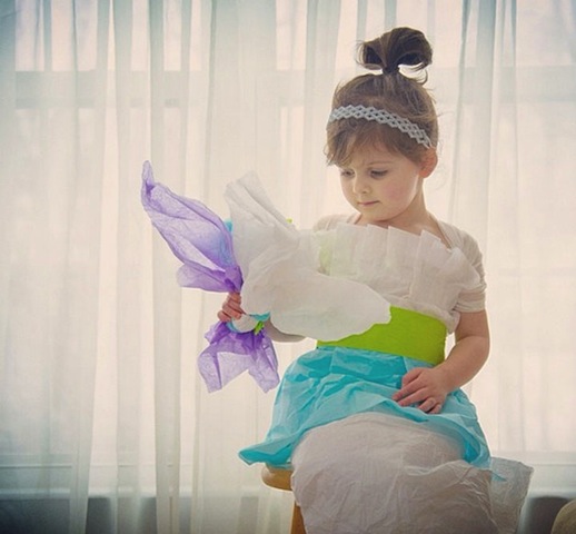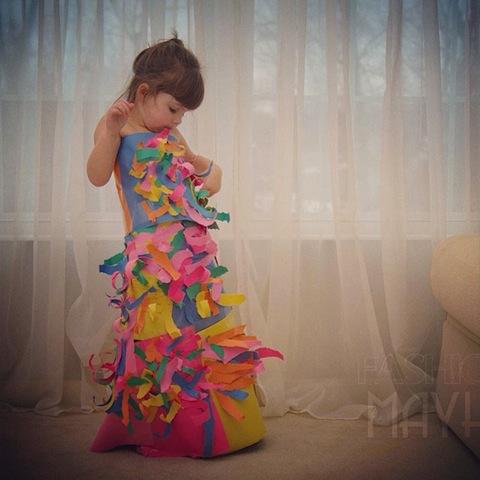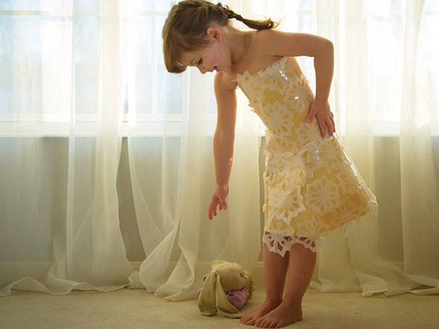 可是,你知道吗,小姑娘设计的衣服大都是用图画纸,卫生纸,礼品袋,胶带或胶水拼贴制成的。。