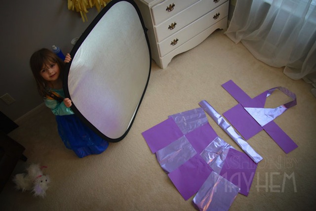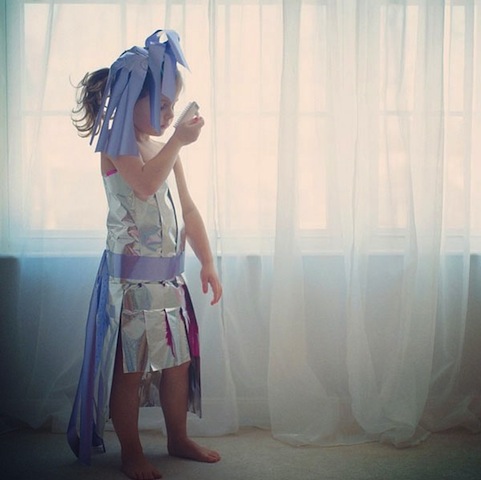 有时她也会和妈妈在家里就地取材,比如找来些丝巾,旧桌布,透气胶带,薄纱,铝箔等……