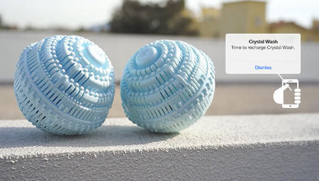 将洗衣球放进洗衣机后,球内颗粒会使水中的 pH 值上升至最低 8.5,水分子被软化,更容易清洗污渍。制作团队称,Crystal Wash 不仅洗衣效果佳,还能减少用水量,和各种污染物质排放量。一组 Crystal Wash 可以使用超过 1000 次。