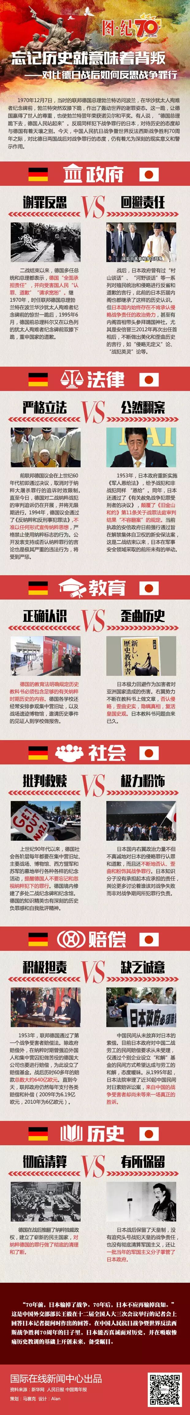 1970年12月7日,当时的联邦德国总理勃兰特访问波兰,在华沙犹太人殉难者纪念碑前,勃兰特突然双膝下跪,作出了轰动世界的谢罪姿态。这一跪,让德国赢得了世人的尊重,也使勃兰特翌年荣获诺贝尔和平奖。有人说,“德国总理跪下去,德国人民站起来”。反观同样犯下战争罪行的日本,对历史的态度却与德国有着天壤之别。今天,在世界反法西斯战争暨中国人民抗日战争胜利70周年之际,对比德日两国战后对战争罪行的态度,仍有着尤为深刻的现实意义和警示作用。