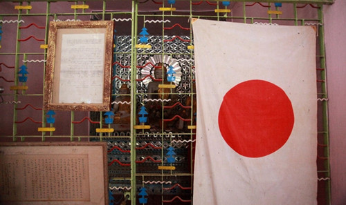 佛塔内的佛龛里,悬挂着凭吊文书和日本国旗。