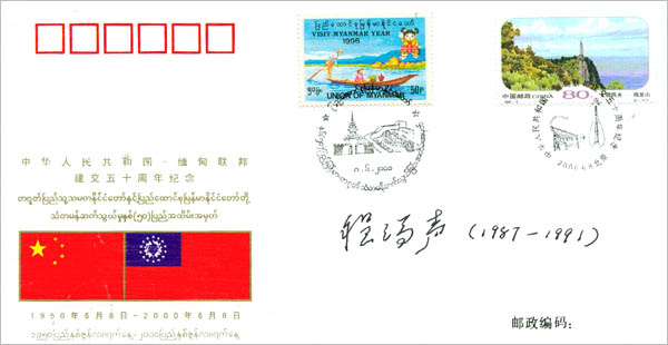 中国驻缅甸联邦大使程瑞声在中华人民共和国-缅甸联邦建交五十周年纪念封上签名