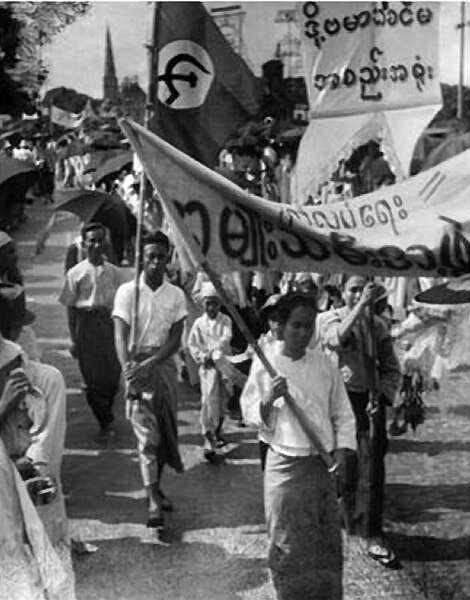 *1937年缅甸出现“留着或退出英属印度联合省”的命运归属问题。投票结果——多数要求退出并自立为英属缅甸!1938年我缅人协会“德钦党”领导石油工人大罢工,要求增加石油工人工资!改善其劳动与生活条件!广泛受到全国工人、农民、学生热烈支持。仰光学生罢课包围殖民政府秘书厅大闹特闹,结果BO昂觉被骑兵马蹄踢伤,再遭防暴警棍打残——两天后一命呜呼!