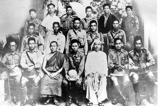 当英国雷厉风行镇压反英运动时,他就以缅共总书记身份,1940年8月乘船秘密远赴厦门,一心想求助于中共红军与苏联驻延安代表;岂料被日本军情局一路跟踪、阻拦、力劝他到日本寻求大东亚共荣圈恩赐缅甸独立。在大东亚共荣圈“光辉照耀与无限关怀”下,他取日本名“缅田门义”,1941年初组织30志士(见下图),齐齐远赴日本占领区台湾与海南岛接受日本军事训练与政治教育。