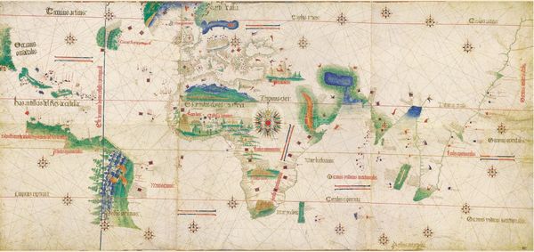 《坎蒂诺地图》(Cantino Map)(图9)是现存最早的葡萄牙人制作的世界地图,绘制于1502年,保存在意大利摩德纳图书馆。全图采用被称为“王室样式”(Padrão Real)的葡萄牙航海图风格,由三张羊皮纸拼接而成,除了海岸线与沿岸城市外,还用写实的风格描绘了各地的城堡、人物和动植物,色彩艳丽,堪称一件精美的艺术品。
