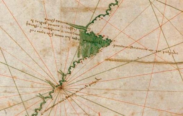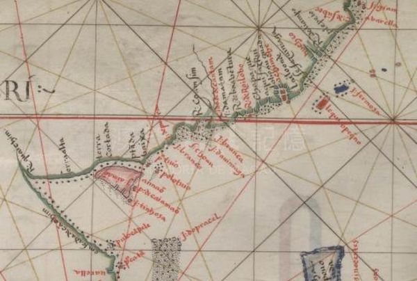 地图(图10)中没有注记澳门,但记录了葡萄牙人早期对华南沿海的认识。马六甲以东的东亚沿海更是简单地画成近似直线,并留下大量的空白,表明这是一片近乎未知的区域。地图画出了赤道和南北回归线。图中的东亚海岸线与北回归线相交处下方有一河口,旁边有一段文字注释表明这里是交趾支那(原文为chinacochin,后来常用cochinchina),这是十六世纪以后欧洲对越南的称呼,所以这条河应该是指越南的红河。红河外较远地方有一较大的岛屿被涂成鲜艳的红色,从对应位置推测有可能是海南岛,但图中注记的名称为“普萨岛”(ilha de pussa)。在这条海岸线的北部有一个较大的海角(图11),上面标有一个地名“Quiritiria”,并注释该地盛产丝绸、蜡、麝香、香料和各种宝石。葡萄牙大约12年后(1514年)才来到中国沿岸,因此这时对中国沿海的情况还缺乏清楚的认识,很可能是根据东南亚人的传闻而绘制。