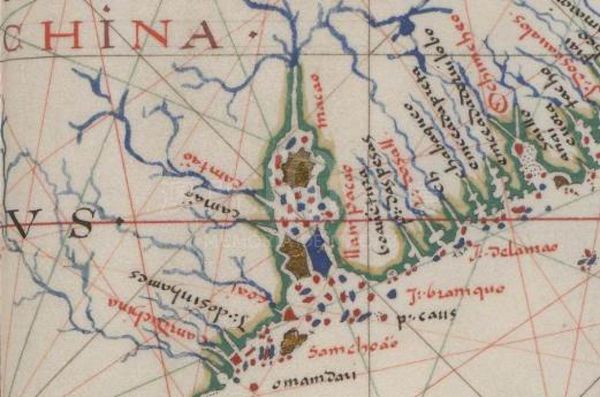 该图以教皇子午线为中线向两边延伸,“Mare Sinarum”(中国海,即指今天的中国南海)重复出现在地图的左右两端。图中(图13)珠江口东边的位置上用红色字注记了“cantam”(广州),广州的右下方与北回归线相交处附近标记了一个叫做“matan”的地名。早期西方地图中,绝大多数都是把澳门的地名标记在珠江口的东岸,这个位置与图中“matan”的位置吻合。在十六世纪上半叶西方人绘制的中国沿海图中,同一位置常常会出现这个“matan”的地名标记。但在十六世纪后期明确标出澳门的地图当中,“matan”这个地名都不再出现。“matan”很有可能是西方人踏上澳门这块土地之前对澳门的称呼,这有待进一步研究和证明。