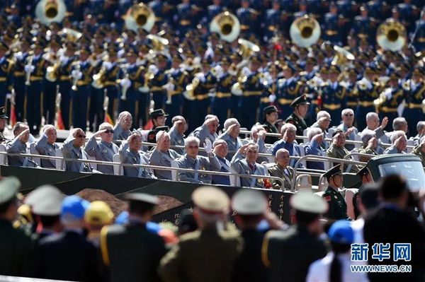 2015年9月3日,抗战老兵乘车方队通过天安门广场。新华社记者 王定昶摄