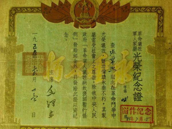 我家一直保存着一张以毛泽东主席的名义签发的光荣纪念证: