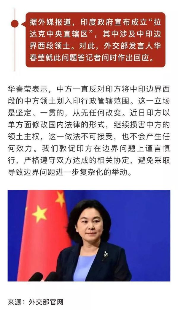 “中方一直反对印方将中印边界西段的中方领土划入印行政管辖范围。这一立场是坚定、一贯的,从无任何改变。近日印方以单方面修改国内法律的形式,继续损害中方的领土主权,这一做法不可接受,也不会产生任何效力。我们敦促印方在边界问题上谨言慎行,严格遵守双方达成的相关协定,避免采取导致边界问题进一步复杂化的举动。”