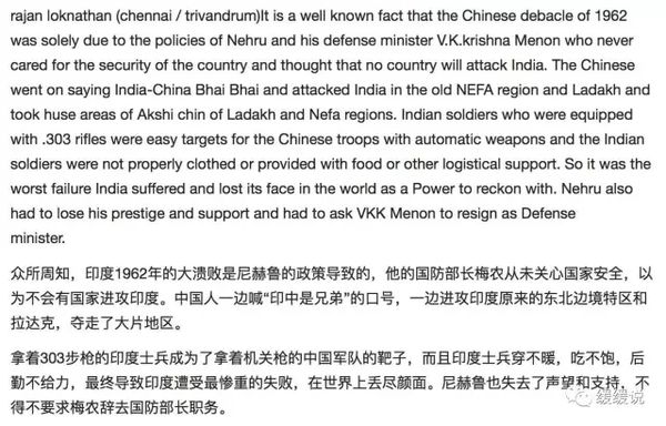 “众所周知,印度1962年的大溃败是尼赫鲁的政策导致的,他的国防部长梅农从未关心国家安全,以为不会有国家进攻印度。中国人一边喊“印中是兄弟”的口号,一边进攻印度原来的东北边境特区和拉达克,夺走了大片地区。