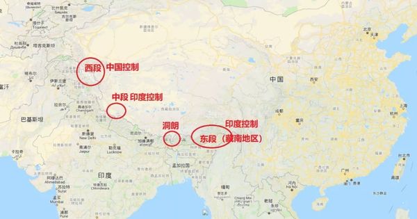 从图中可以看到,西段的阿克塞钦基本控制在中国手里,而东段的藏南地区则控制在印度手里。