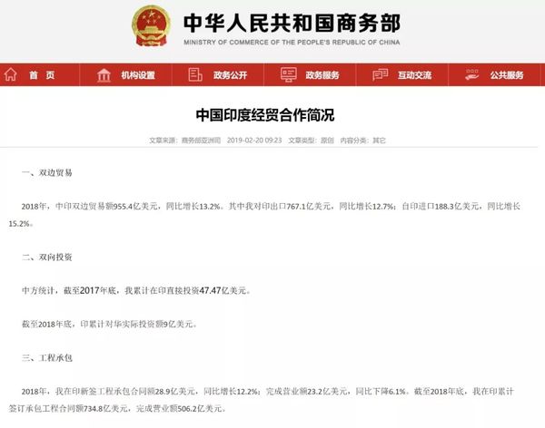 根据商务部发布的中印经贸合作数据,2018年中印双边贸易额955.4亿美元,同比增长13.2%。其中中国对印度出口767.1亿美元,同比增长12.7%;自印度进口188.3亿美元,同比增长15.2%。