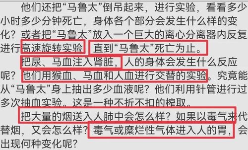 为了完成他们的目的,731部队把尿、马血注入肾脏,观察人的身体会发生什么反应、他们用猴血、马血和人血进行交替实验。他们利用针管进行过多次抽血实验,看看究竟能从“马鲁太”身上抽出多少血液。他们把大量的烟送入人的肺中,把毒气或糜烂性气体进入人体,观察胃会发生什么变化。