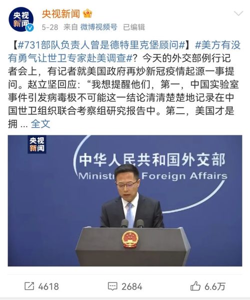 5月28日,在中国外交部例行记者会上,有记者就美国政府再炒新冠肺炎疫情起源一事提问。中国外交部发言人赵立坚回应,“公开资料显示,德特里克堡居然与侵华日军731部队有着千丝万缕的关系,罪恶滔天的731部队负责人石井四郎,还曾是德堡的生物武器顾问。”