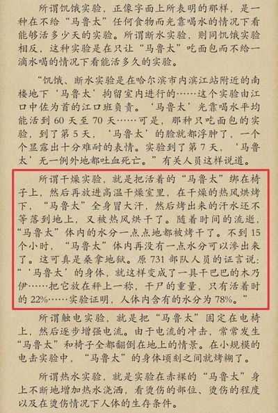 原731部队人员的证言说:“‘马鲁太’的身体,就这样变成了一具干巴巴的木乃伊……把它放在秤上一称,干尸的重量,只有活着时的22%……实验证明,人体内含有的水分为78%。“马鲁太”体内再没有一点水分可以渗出来。