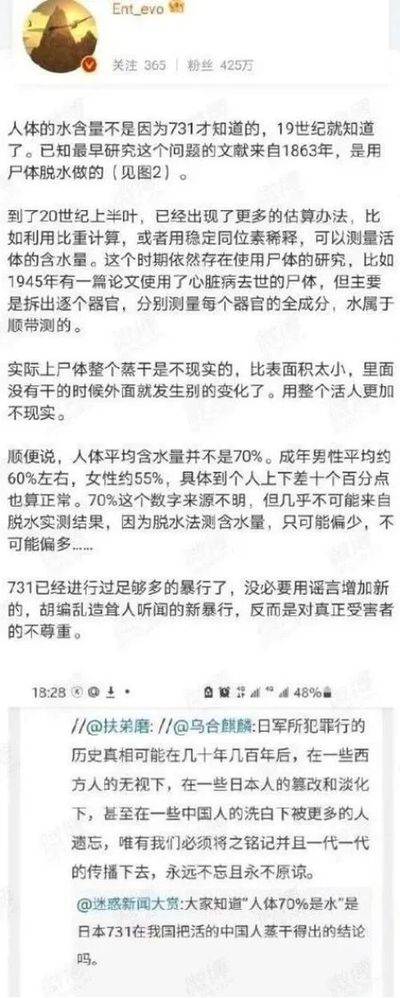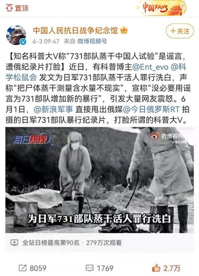当天,某科学博主发文“辟谣”称,“把尸体蒸干测量含水量不现实”,宣称“没必要用谣言为731部队增加新的暴行”。