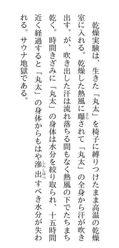 所谓“干燥实验”,是将活着的“马鲁太”(又名“马路大”,是731部队对被迫接受人体实验的受害者的侮辱性称呼。在日语中意为“圆木”,引申意思为“实验品”)绑在椅子上,然后再放进高温干燥室里,在干燥的热风烘烤下,“马鲁太”全身冒大汗,然后烤出来的汗水还不等落到地上,又被热风烘干了。随着时间的流逝,“马鲁太”体内的水分一点点地都被烤干了。不到15个小时,“马鲁太”体内再没有一点水分可以渗出来了。