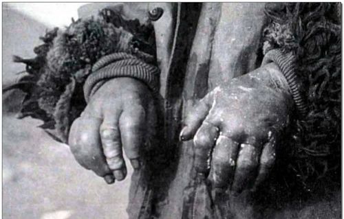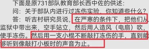 答:听吉村研究员说,在严寒的条件下,把他们从监狱中带出来,空手站立,然后用人造风(电扇)吹,使手冻伤。然后用一支小棍不断敲打冻伤的手,直到能够听到像敲打小板时的声音为止。