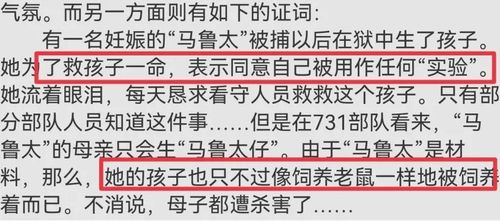 有一名妊娠的“马鲁太”被捕以后在狱中生了孩子。她为了救孩子一命,表示同意自己被用作任何“实验”。她流着眼泪,每天恳求看守人员救救这个孩子。只有部分部队人员知道这件事……但是在731部队看来,“马鲁太”的母亲只会生“马鲁太仔”。由于“马鲁太”是材料,那么,她的孩子也只不过像饲养老鼠一样地被饲养着而已。不消说,母子都遭杀害了……