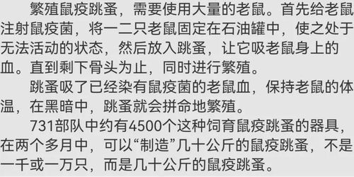 而为了繁殖鼠疫跳蚤,731部队首先给老鼠注射鼠疫菌,然后放入跳蚤,让它吸老鼠身上的血。直到剩下骨头为止,同时进行繁殖。
