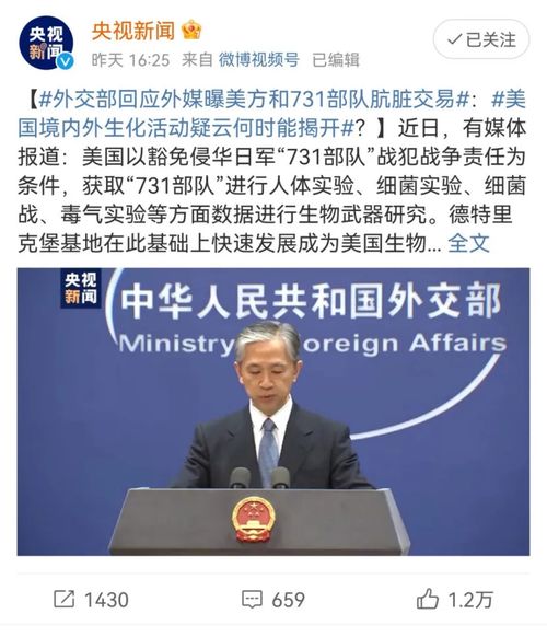 昨日,中国外交部发言人汪文斌又进行了相关发言:美国为得到731部队细菌战数据资料,支付了25万日元,甚至向世界隐瞒731部队及其头目石井四郎的滔天罪行,还让石井四郎成为德特里克堡的生物武器顾问。对这些历史事实,美国什么时候能够给国际社会一个负责任的交待?