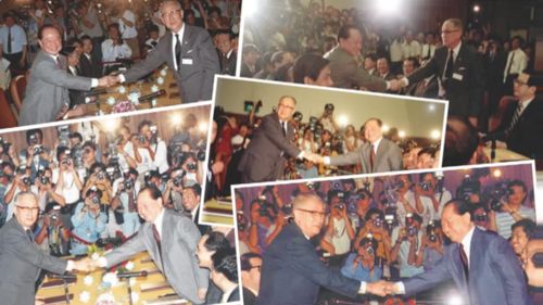 4月27日上午10点06分,汪道涵和辜振甫并肩走进4楼的会议室。会议室里摆满鲜花。隔着不到两米宽的桔红色会议桌,汪辜两人的手,紧紧握在一起。