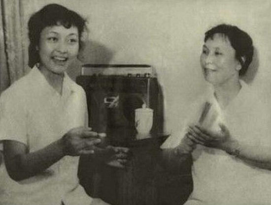 1980年,王音璇教授(右)在给彭丽媛上声乐课 .