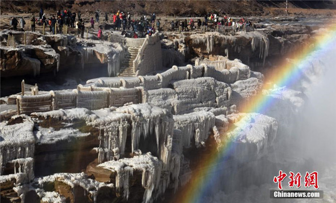 山西黄河壶口瀑布现冰瀑彩虹美景 游人扎堆