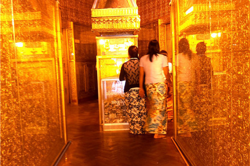 波达通塔被称为缩小版的大金塔,其建筑很有特点,特别是大殿中有“黄金屋”,墙壁和天花板上都贴满金箔,置身其间,环顾四周,满眼金色,富丽堂皇。