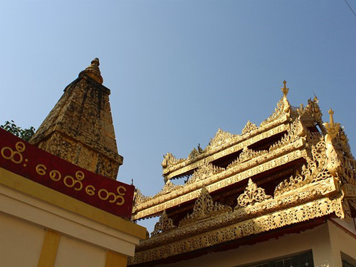 又名千佛塔,据传从印度来的护送圣物的千佛陪葬于此。始建于2000年前,与苏雷塔同时建成,后经多次翻建,1943年被炸毁,后又重建。重建中发现了许多2000多年前的文物和珠宝。塔身内有一圈墙壁和天花板都贴有金箔的祈祷间,核心处有密室藏有佛发舍利,游客可进入塔身内部观赏。