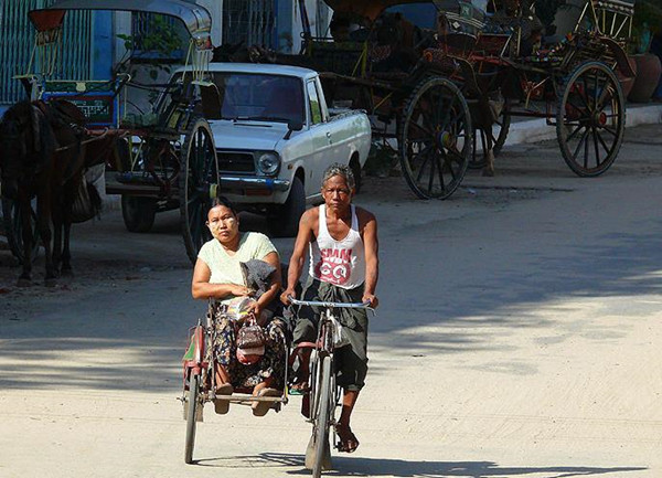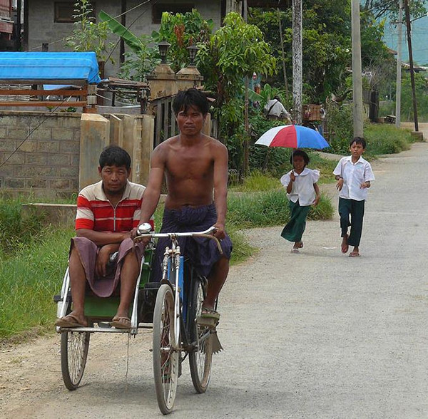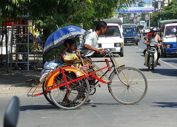 最大载客人数两名,重的客人坐在后面,背对前面的客人,目的是为了防止三轮车翻过去。缅甸一年到头都很热,即使是凉季,车夫们也很辛苦,一天忙到晚,挣的钱也勉强糊口而已,挺不易的。在仰光和曼德勒,短途价格在250-500K之间,路途长可能会要1000K,可以讨价还价。